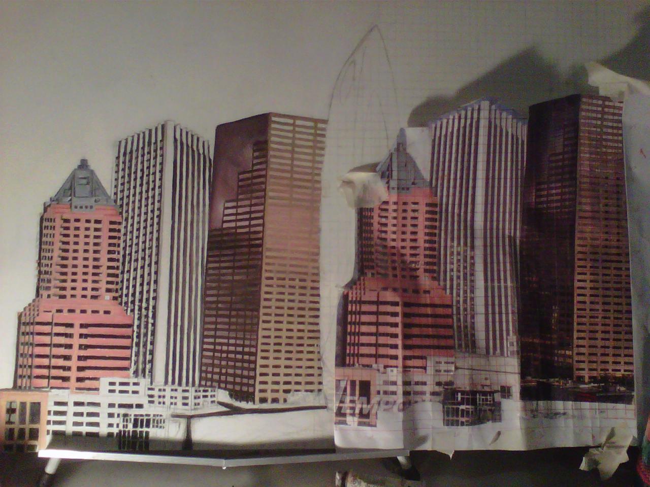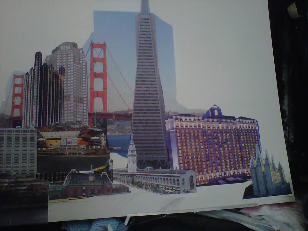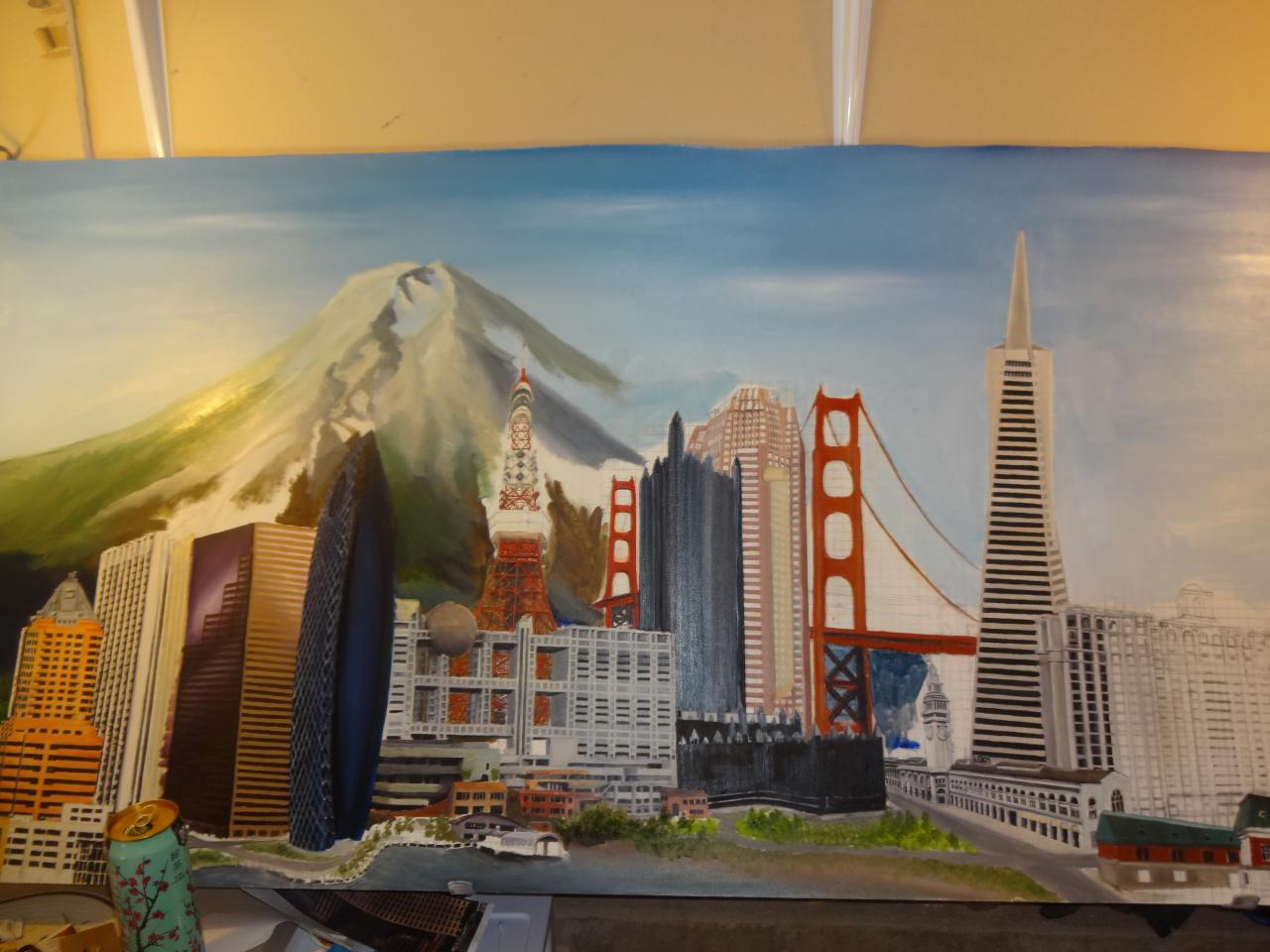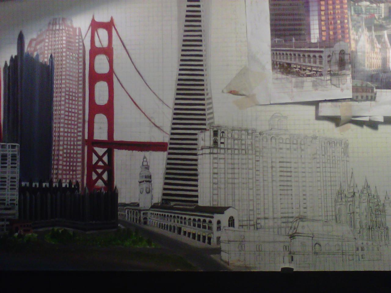 The "Cities" painting is 6 feet long by just over 3 feet tall. It contains three buildings/structures that are from the cities that the commissioner has lived in. The 15 structures are to be put together to appear as one city. The cities are Philadelphia, Pittsburgh, Salt Lake City, San Francisco, and Tokyo. The backgroung it to be lined with Mount Fuji and the Rocky MountainsThe first three photos are the photo copies arranged for the layout.