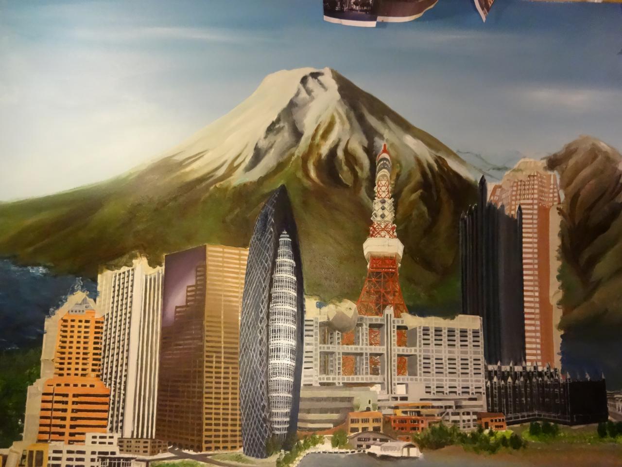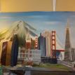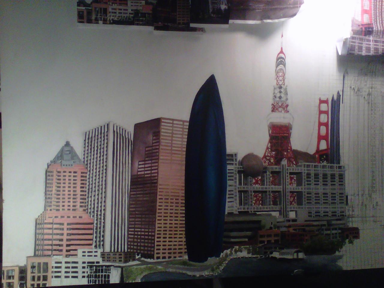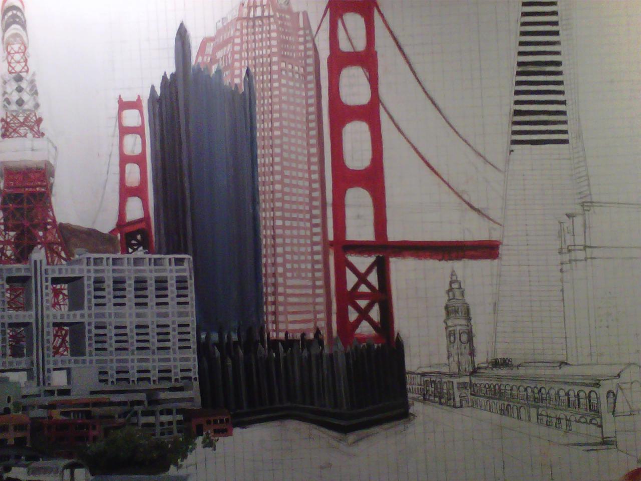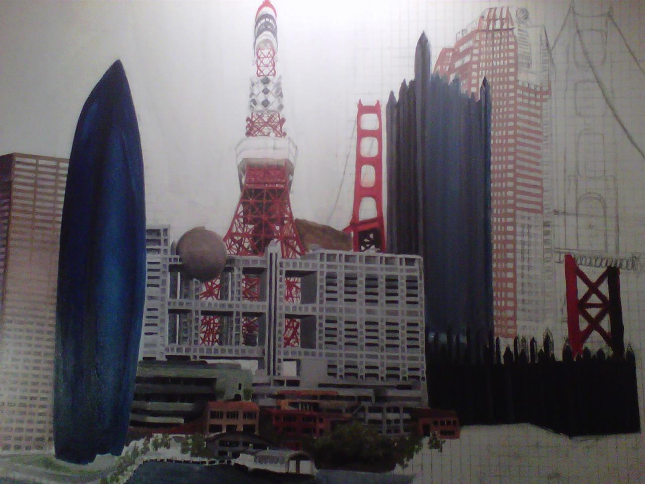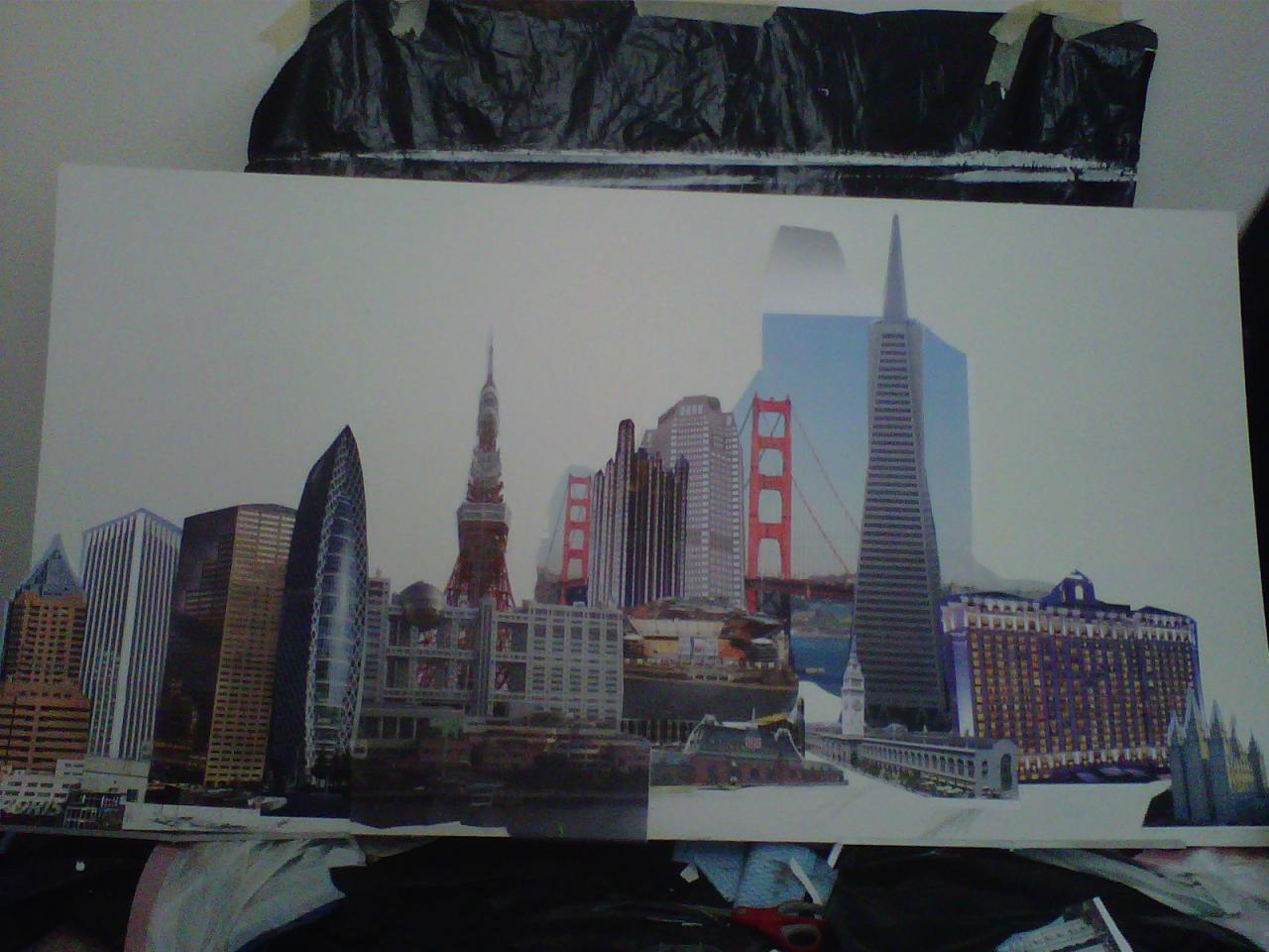 The "Cities" painting is 6 feet long by just over 3 feet tall. It contains three buildings/structures that are from the cities that the commissioner has lived in. The 15 structures are to be put together to appear as one city. The cities are Philadelphia, Pittsburgh, Salt Lake City, San Francisco, and Tokyo. The backgroung it to be lined with Mount Fuji and the Rocky MountainsThe first three photos are the photo copies arranged for the layout.