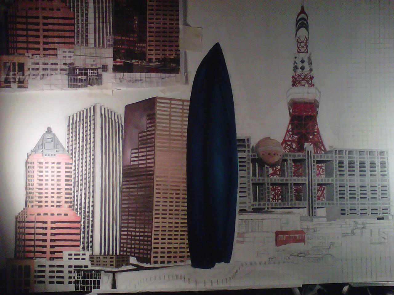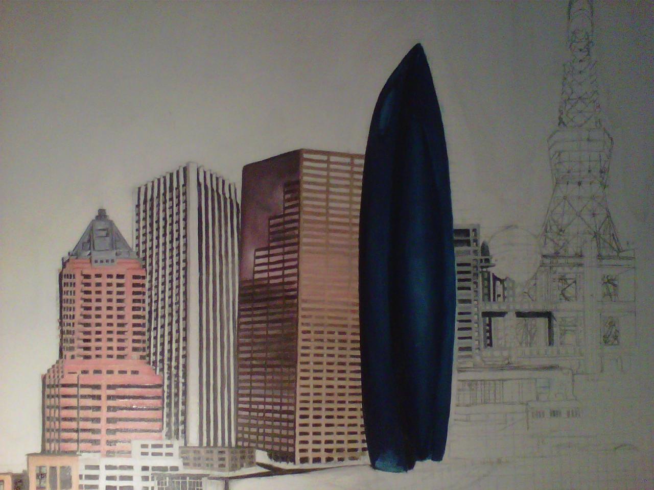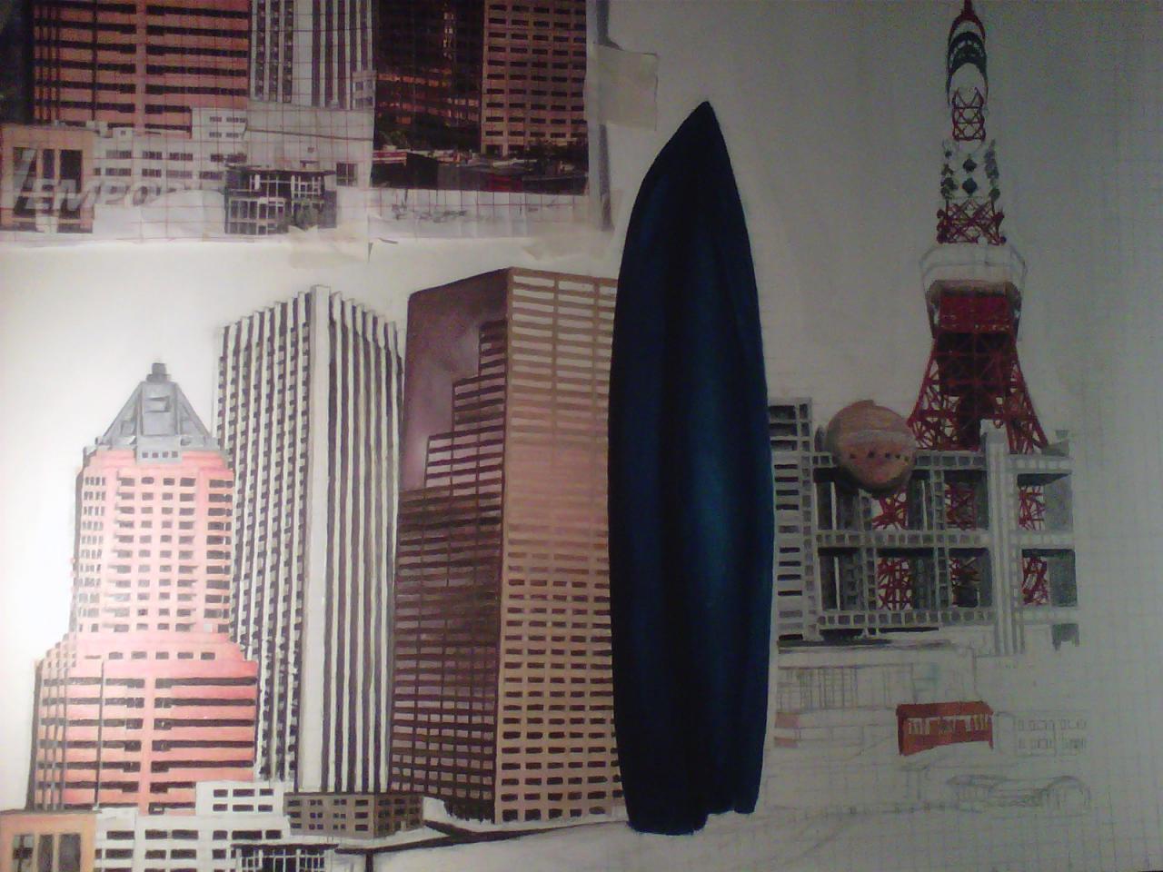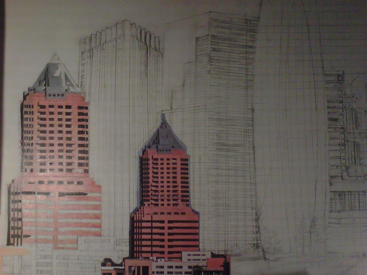 The "Cities" painting is 6 feet long by just over 3 feet tall. It contains three buildings/structures that are from the cities that the commissioner has lived in. The 15 structures are to be put together to appear as one city. The cities are Philadelphia, Pittsburgh, Salt Lake City, San Francisco, and Tokyo. The backgroung it to be lined with Mount Fuji and the Rocky MountainsThe first three photos are the photo copies arranged for the layout.