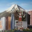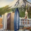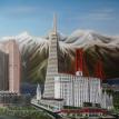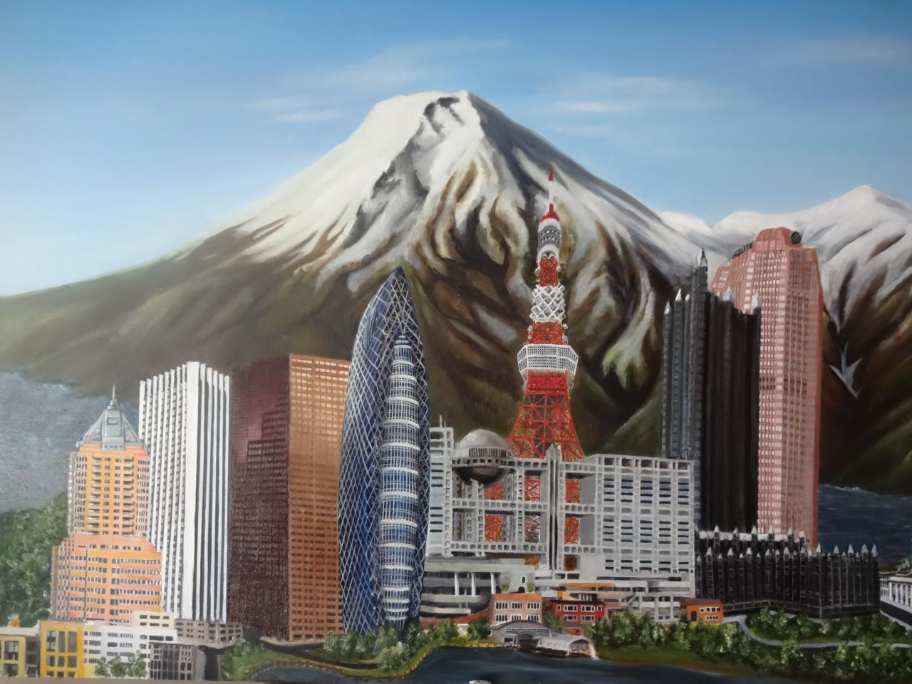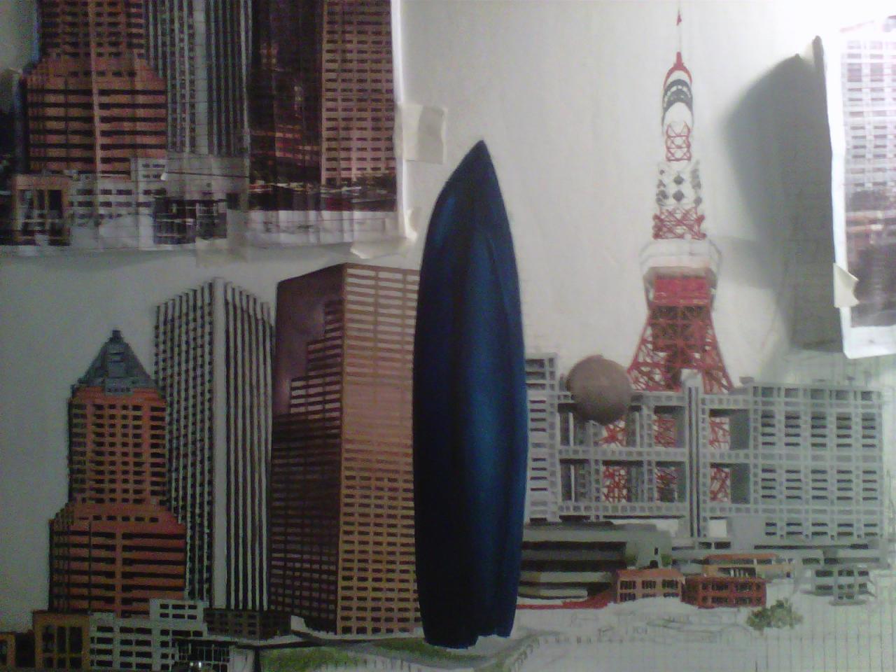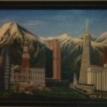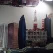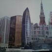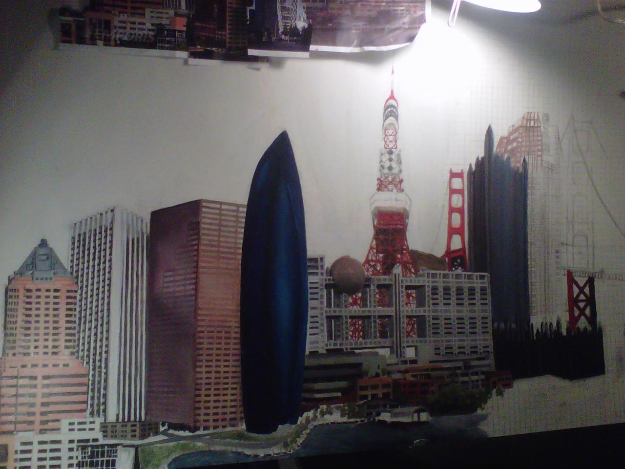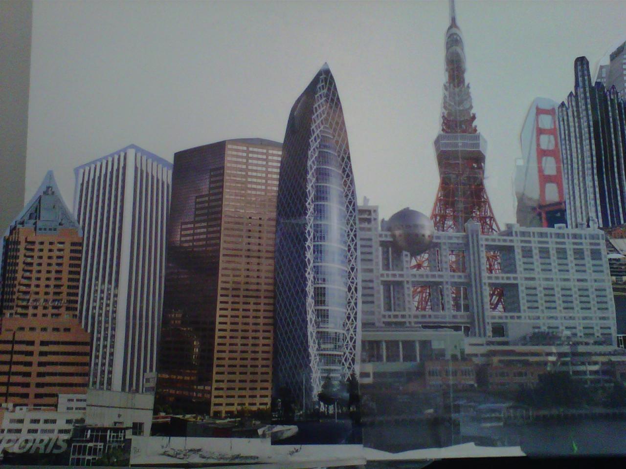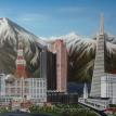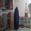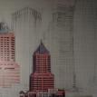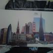 The "Cities" painting is 6 feet long by just over 3 feet tall. It contains three buildings/structures that are from the cities that the commissioner has lived in. The 15 structures are to be put together to appear as one city. The cities are Philadelphia, Pittsburgh, Salt Lake City, San Francisco, and Tokyo. The backgroung it to be lined with Mount Fuji and the Rocky MountainsThe first three photos are the photo copies arranged for the layout.